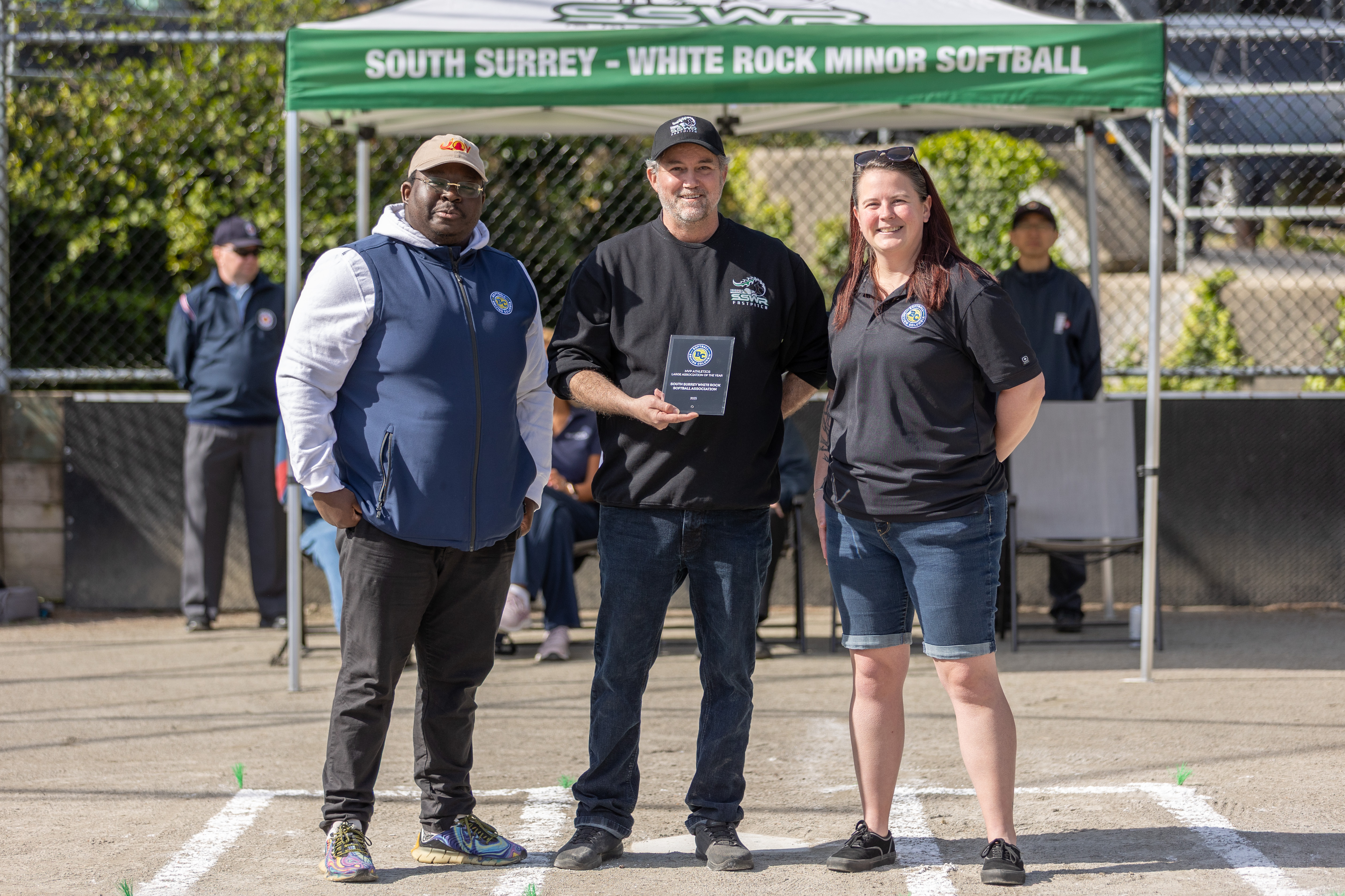 Shaquille Gilbert (Softball BC Umpires & Championships Director), Thomas Bell (President SSWRMSA), Rachel Allan (President Softball BC)